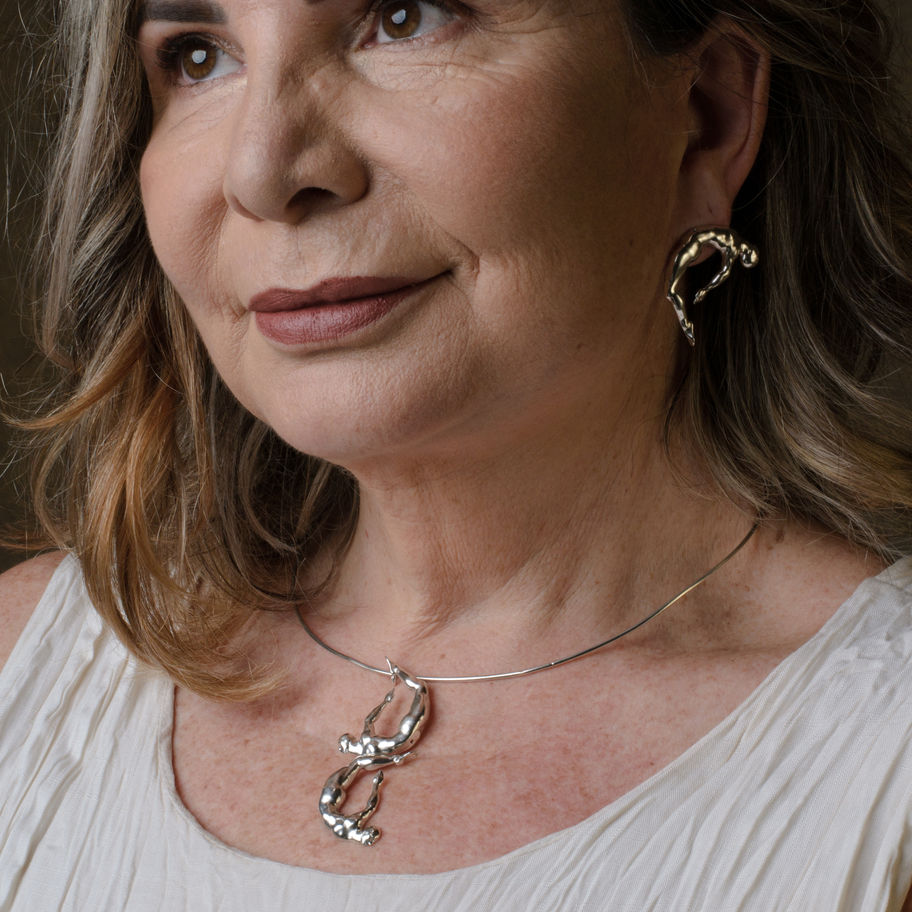 Pingente confeccionado em Prata 925, composto por dois elementos escultóricos que se movem harmoniosamente, lembrando trapezistas. Esta peça faz parte da coleção inspirada na instalação de arte "Linhas, cordas ou cordões umbilicais" de 1999, trazendo a simbologia do fio da vida para o universo das joias. Capturando uma visão estética e existencial sobre a condição humana, este pingente oferece uma representação única e dinâmica da interconexão e movimento contínuo da vida.
